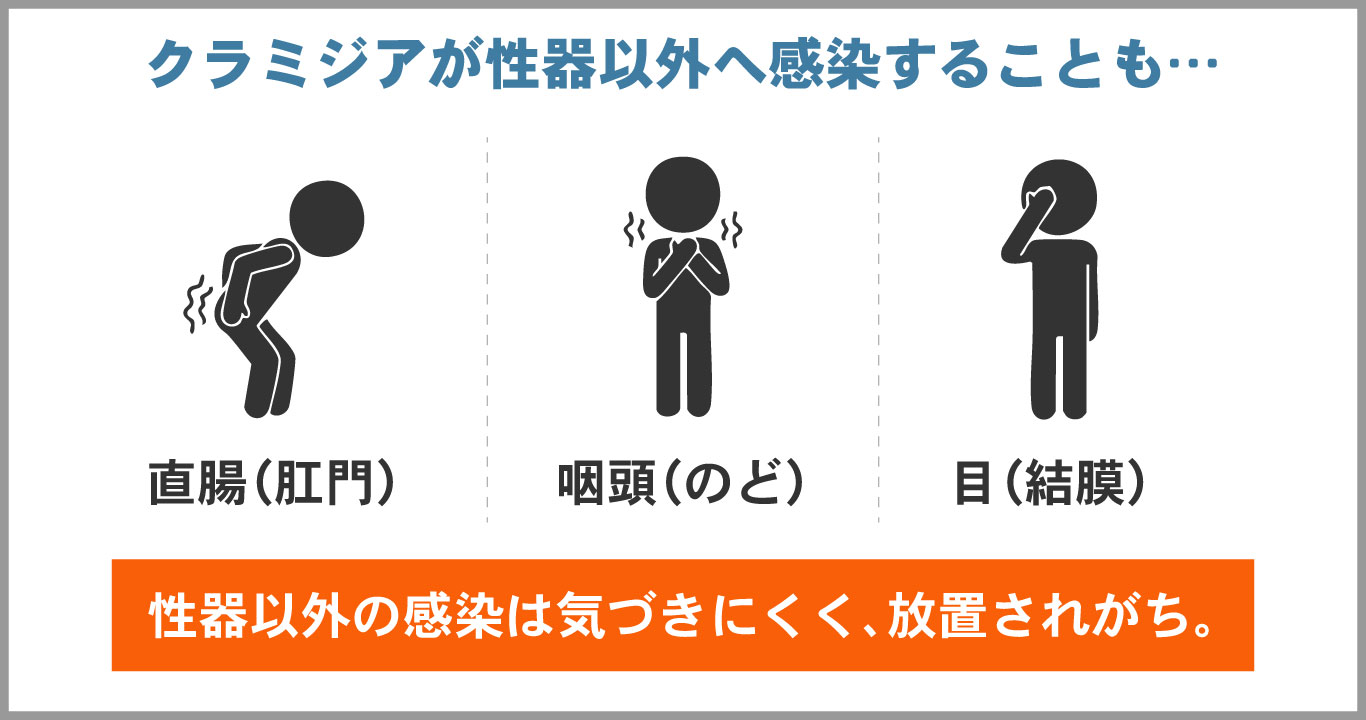 クラミジア感染は性器(尿道・膣頸部)以外にも咽頭(のど)や直腸(肛門)、まれに目(結膜)へ起こることがあります。性器以外の部位に感染した場合、症状から性病を疑いにくかったり自覚症状が乏しいことが多く、放置されてしまうケースがあります。感染の可能性がある行為をした場合は、性器だけでなく咽頭や直腸の検査も同時に受けることが重要です。