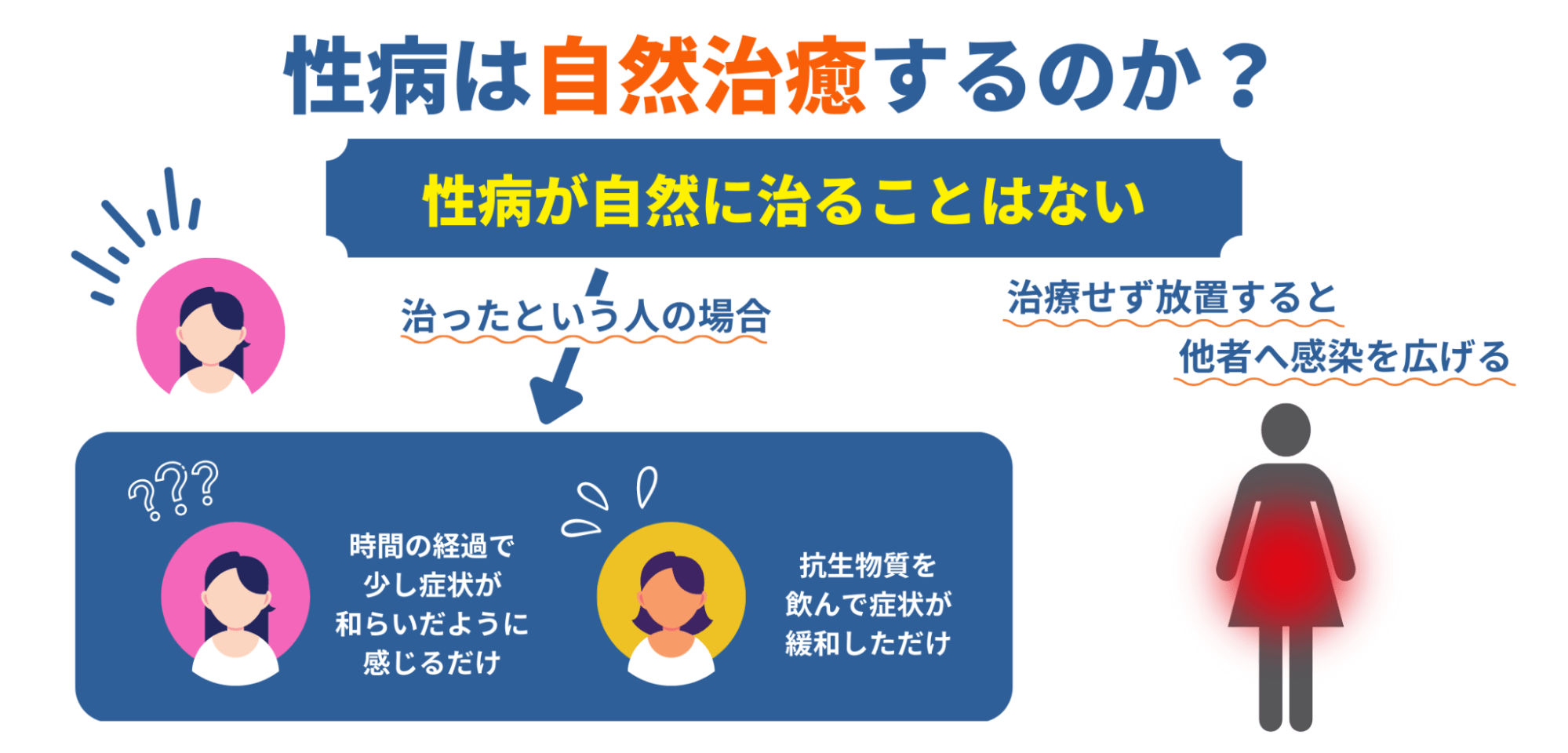 しかし、放置することの一番のリスクは他者への感染を広げてしまうことです。知らないうちにパートナーなど他人へうつしてしまうことで後遺症に繋がる可能性もあります。