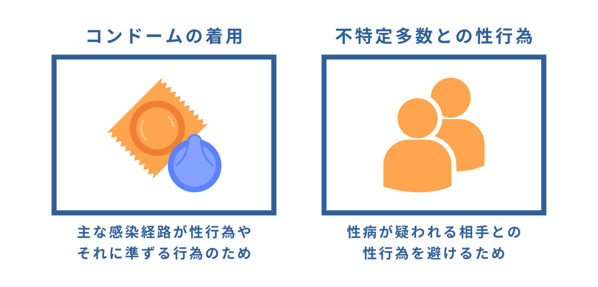 コンドームを着用すること、不特定多数の人との性行為やそれに準ずる行為を控えることでリスクを抑えることができます。