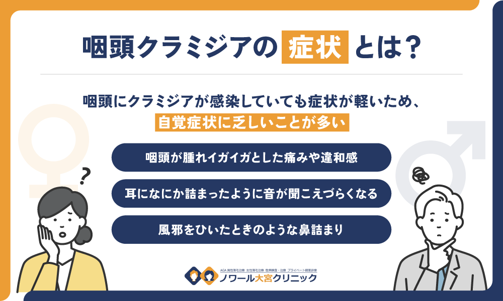 咽頭にクラミジアが感染していても症状が軽いため、自覚症状に乏しいことが多いです。