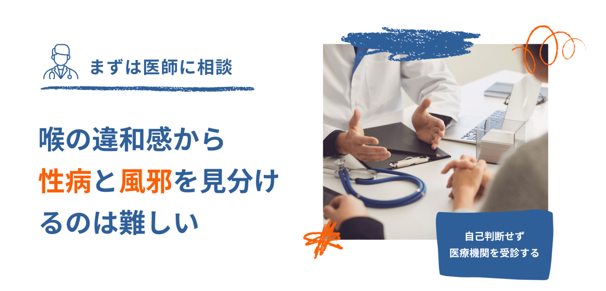 オーラルセックスやディープキスのような、性行為に準ずる行為の後に咽頭が痛い、違和感を感じる場合は医療機関で検査をおすすめします。